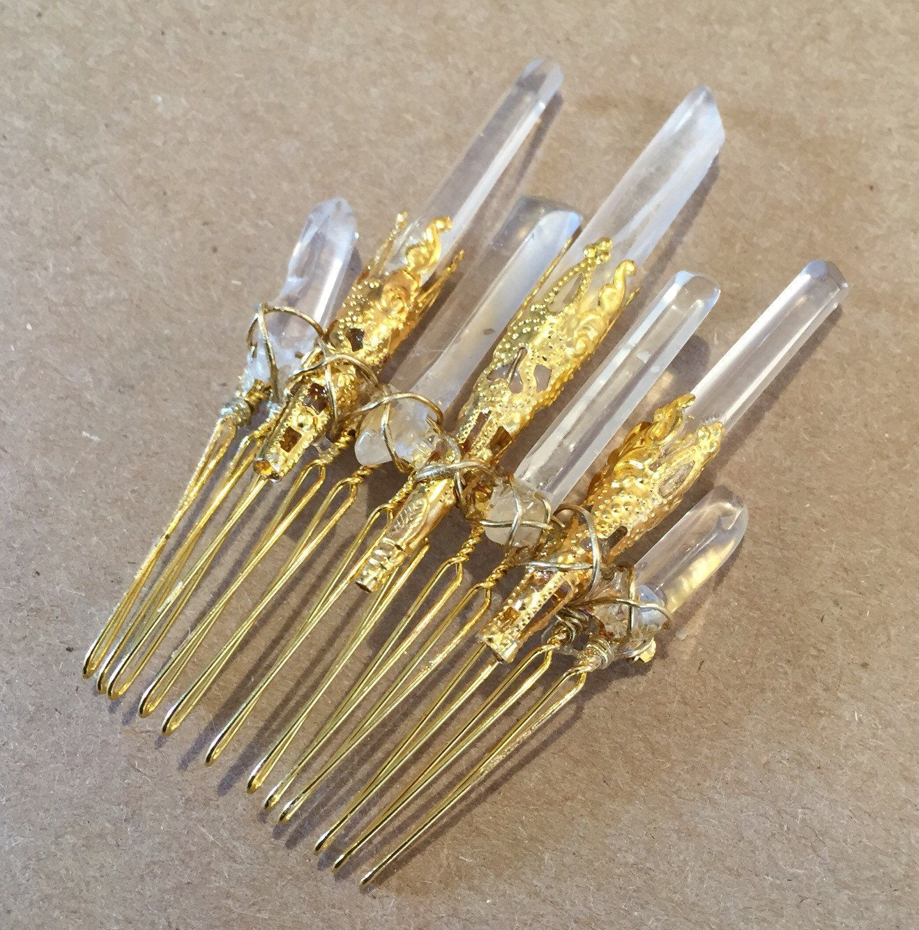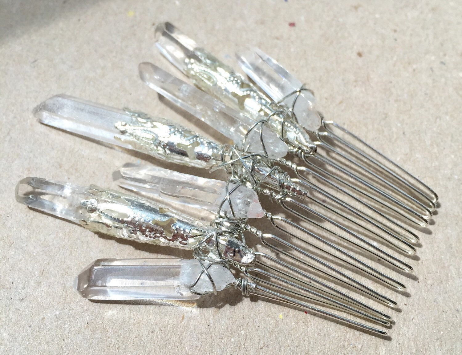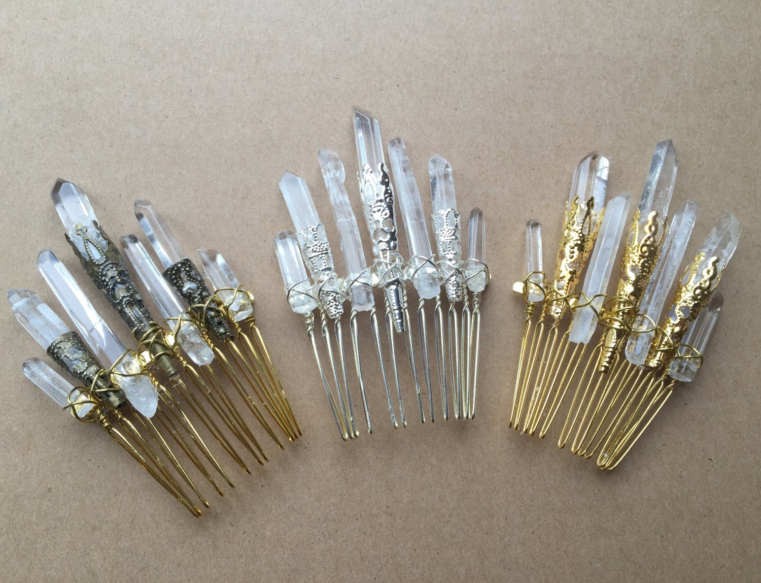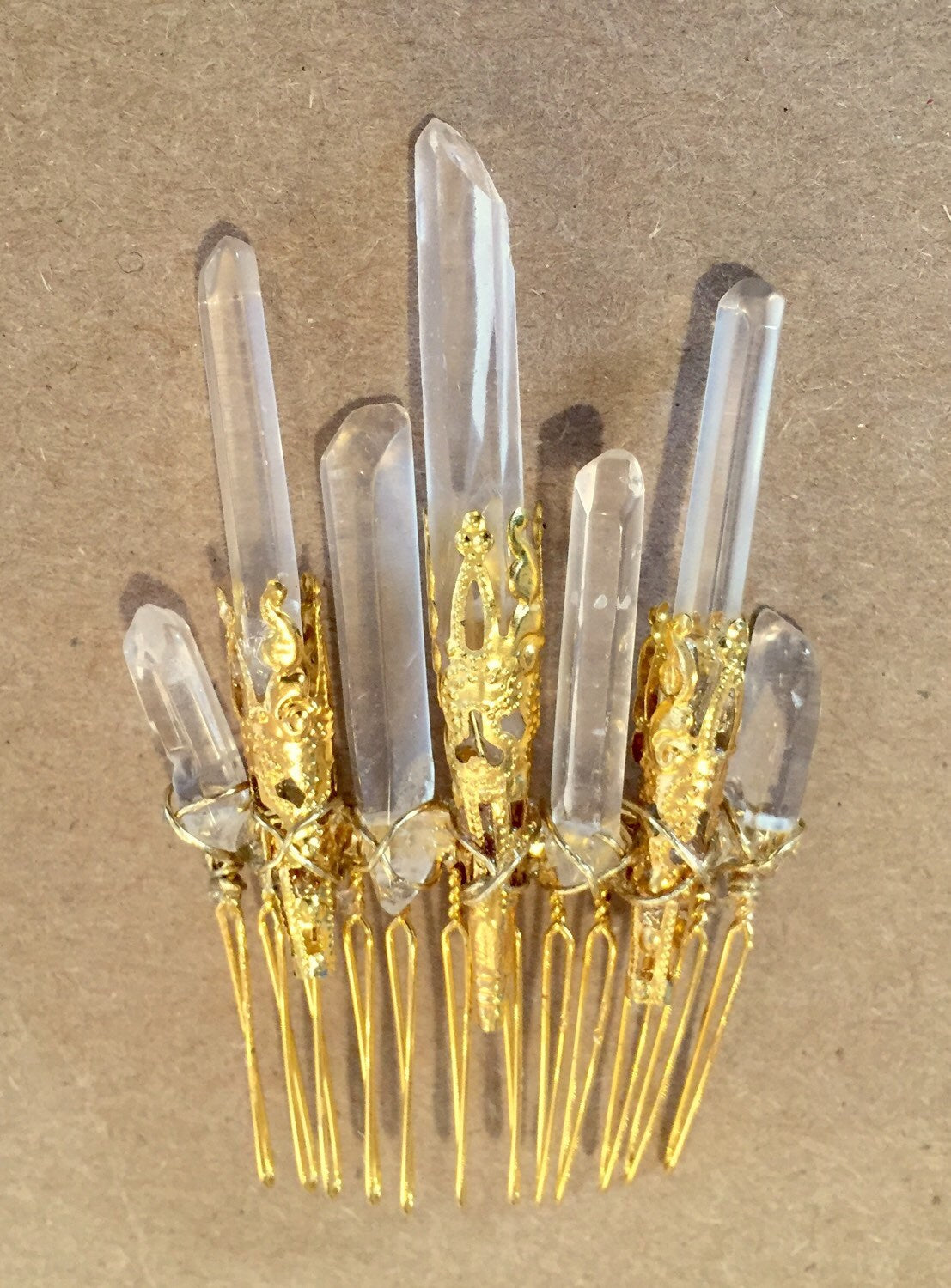 A delicate hand made 5cm (2 inch) comb decorated with natural polished shards of pure rock crystal. Can be used to secure hair, or tucked into a bun for beautiful, twinkling decoration. Let nature be your decoration. Crystal Quartz is prized for its beauty, but also it's energising, powerful metaphysical power.